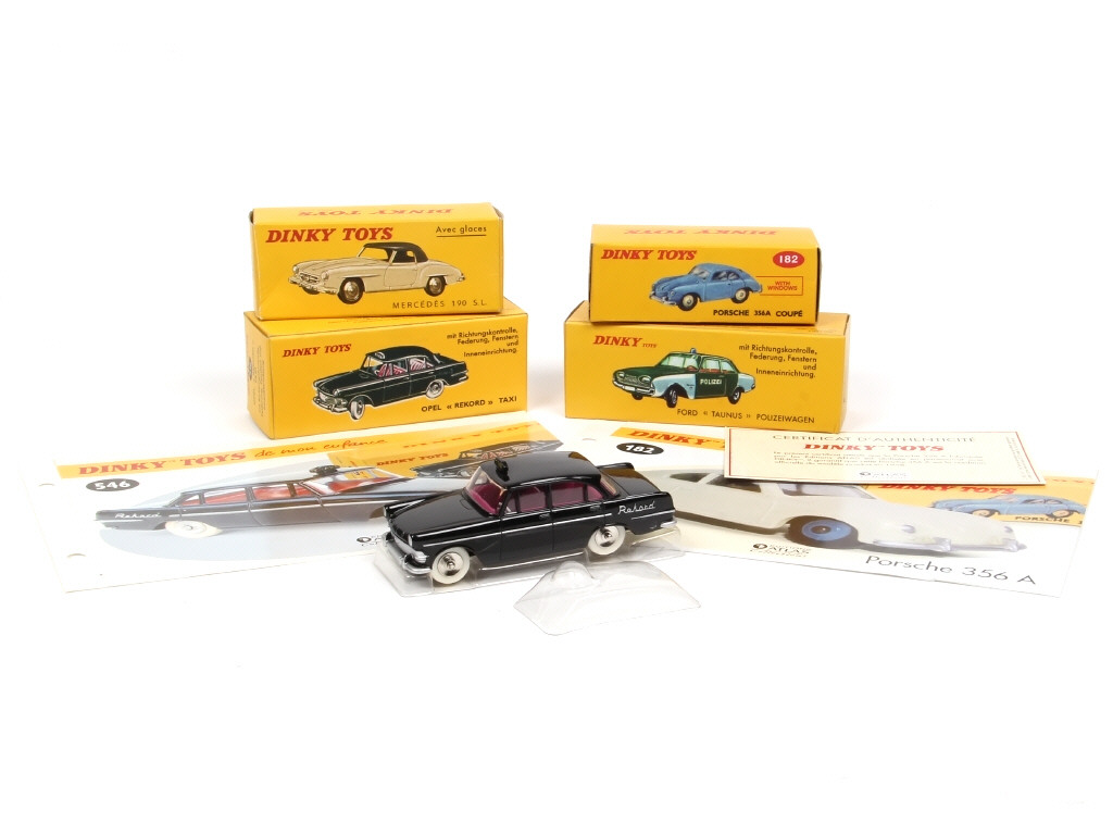 comprend les modèles : FORD TAUNUS 'POLIZEI', PORSCHE 356, OPEL REKORD 'TAXI' & MERCEDES 190 SL - avec 2 fiches illustrées & un certificat
