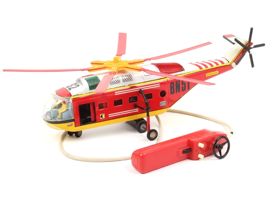 longueur 40 cm - moteur à piles (fonctionne) - la direction & les feux sont filoguidés - une pâle cassée & manquante - une petite restauration sur un élément