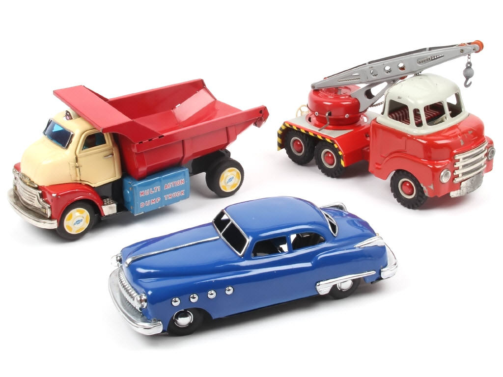 avec moteurs à piles (à revoir) & à friction (fonctionne) - avec petites restaurations & parties repeintes - on y retrouve notamment la marque YONEZAWA TOYS
