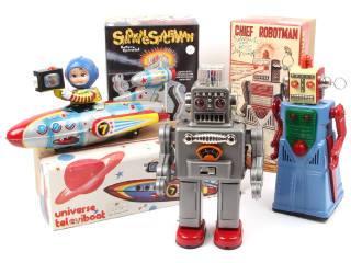 hauteur moyenne 30 cm - moteurs à piles (2 fonctionnels) - légers frottements sur un exemplaire - on y retrouve notamment la marque HA HA TOYS