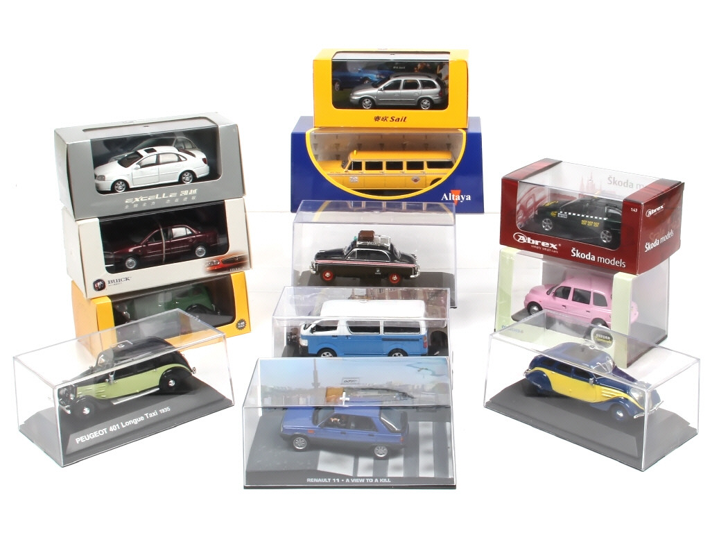 miniatures reproduisant notamment les modèles : BUICK, TOYOTA, SEAT, PEUGEOT, SKODA, AUSTIN & CHECKER - on y retrouve notamment les marques : ABREX, DIP MODELS & ALTAYA - quelques petites fêlures sur certaines boites