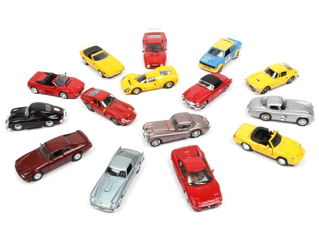 miniatures reproduisant notamment les modèles : FERRARI, PORSCHE, JAGUAR, FIAT, MERCEDES & ALFA ROMEO - on y retrouve les marques : BANG, BRUMM, DETAILCARS, RIO, MODEL BOX, & MEBETOYS - possibilités de petits manques, parties cassées & éléments à refixer sur certains exemplaires