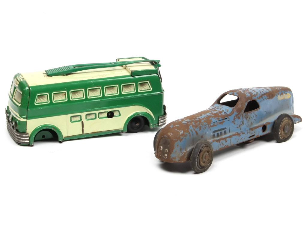 comprend notamment : trolleybus mécanique 'BROADWAY' (moteur à clef fonctionne - avec sonnerie à cloche - manque un essieu & 2 roues) & RENAULT NERVASPORT 28CV de record 1934 (moteur à revoir - pneus endommagés dont un incomplet) - on y retrouve les marques : JOUSTRA & C.I.J