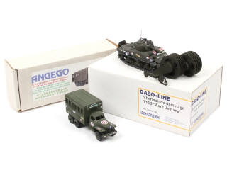 comprend : char SHERMAN démineur & STUDEBAKER 6x6 fourgon - on y retrouve les marques : GASO-LINE & ANGEGO - avec manques, parties cassées, éléments & décalques ajoutés