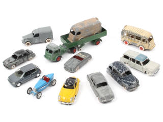 miniatures reproduisant les modèles : RENAULT, SIMCA, BUGATTI, PORSCHE, MERCEDES & CITROËN - on y retrouve les marques : C.I.J, JRD, J.M.K & QUIRALU - avec manques, traces d'humidité, d'oxydation & parties cassées - un exemplaire en état 'B'