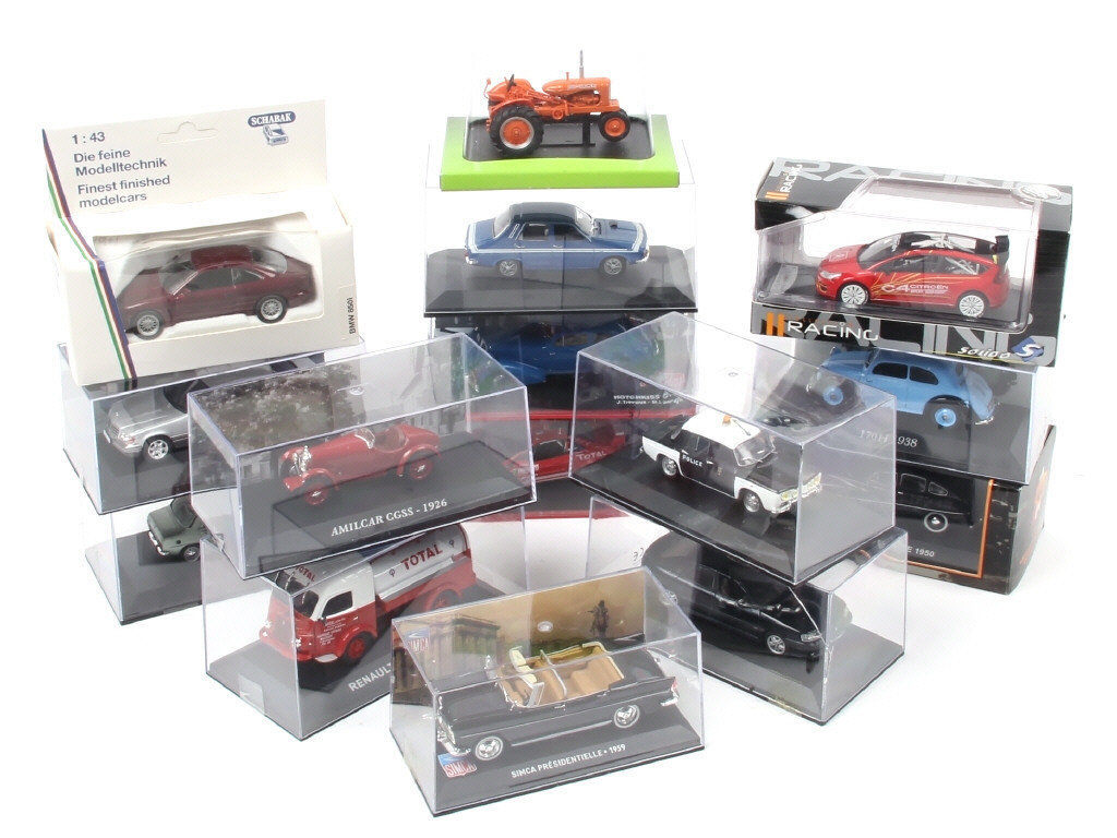 miniatures reproduisant notamment les modèles : RENAULT (un exemplaire avec rétroviseur cassé), SIMCA, AMILCAR & MERCEDES - on y retrouve notamment les marques : SCHABAK, EDITIONS HACHETTE, NOSTALGIE & SOLIDO - possibilité de petits accessoires manquants - les boîtes sont en états de 'a' à 'c'