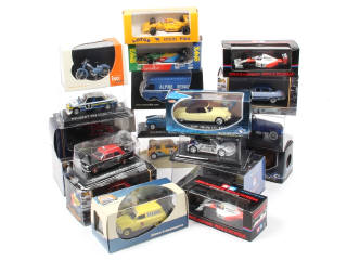 miniatures reproduisant notamment les modèles : SIMCA, CITROËN, Mc LAREN, LOTUS & PEUGEOT - on y retrouve notamment les marques : IXO, TAMIYA, NOSTALGIE & EDITIONS ATLAS - possibilité de petits accessoires manquants - les boîtes en états de 'a' à 'd'