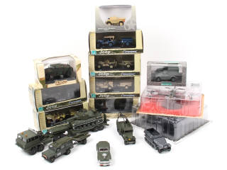 miniatures reproduisant notamment les modèles : JEEP, BERLIET, LAND ROVER & HUMMER - on y retrouve notamment les marques : CARARAMA, SOLIDO & VITESSE - possibilité de petits accessoires manquants - les boîtes sont en états de 'a' à 'b' (6 exemplaires sans boîte) - une remorque en état 'C'