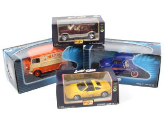 grandes échelles - miniatures reproduisant les modèles : CITROËN 1200 kg, RENAULT 4 CV 'L'ALSACIENNE', FORD EXPLORER & FERRARI 348 TS - on y retrouve les marques : SOLIDO & MAISTO - possibilité de petits accessoires manquants - quelques accrocs sur les boîtes