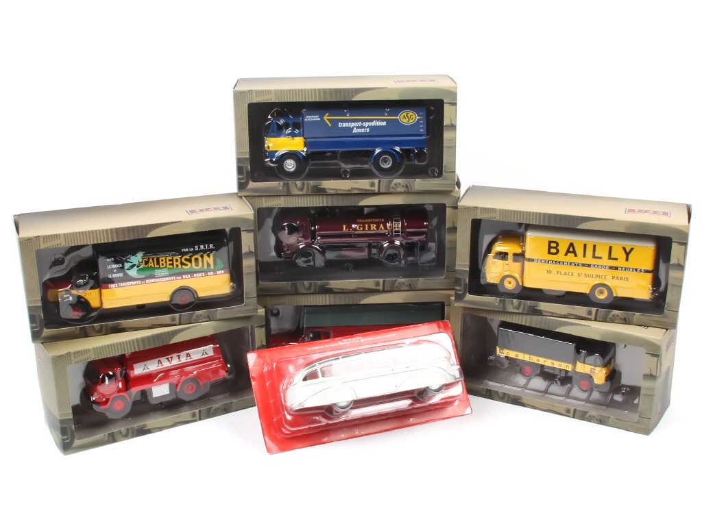 miniatures reproduisant notamment les modèles : SAVIEM, SIMCA, RENAULT & WILLEME - on y joint un autocar MERCEDES de la marque EDITIONS HACHETTE - possibilité de petits accessoires manquants