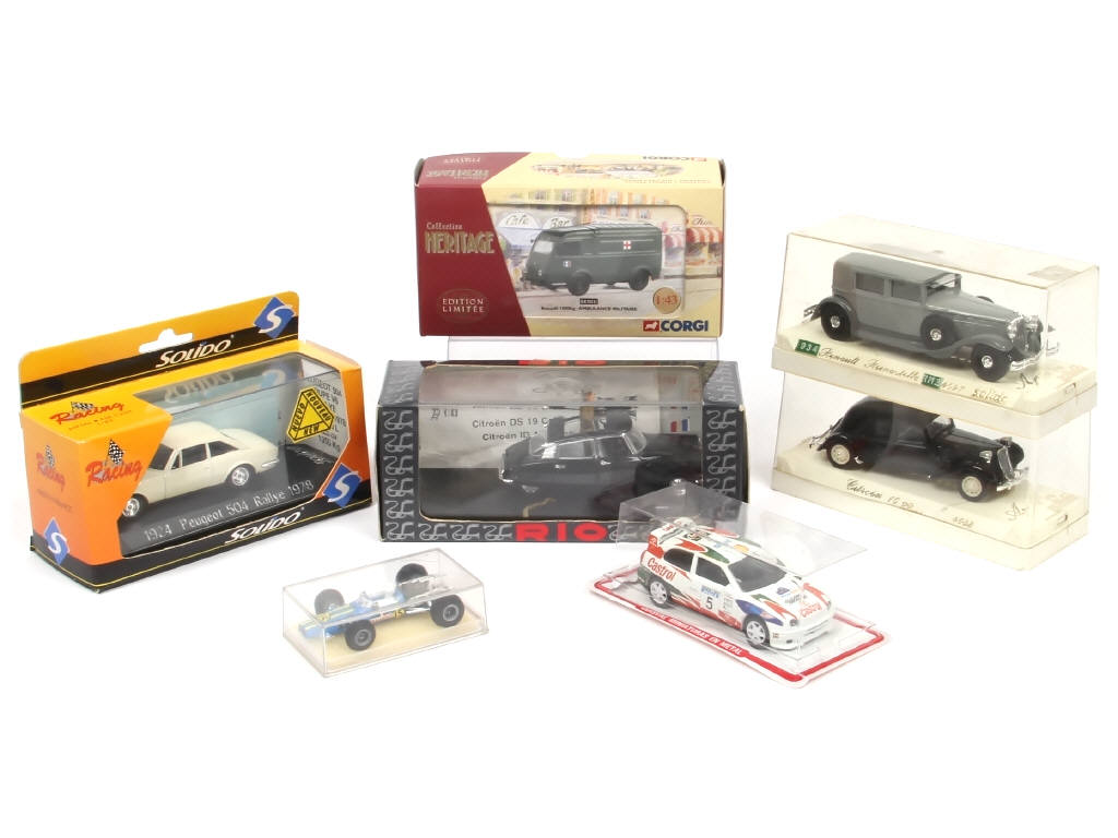 différentes échelles - comprend notamment les modèles : RENAULT, PEUGEOT, CITROEN & MATRA F1 - on y retrouve notamment les marques : RIO, CHAMPION, SOLIDO, GUISVAL & CORGI TOYS (avec certificat & accessoires) - une boite en état 'd'