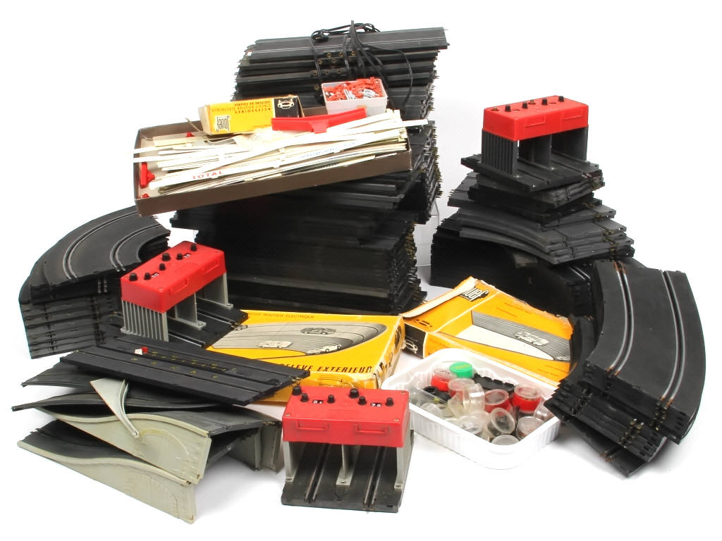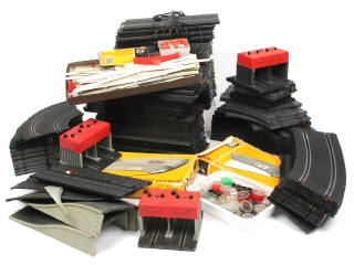 non testé - comprend notamment : rails droits, courbes, virage relevé, comptes-tours, barrières de virage, différentes visseries, patins, pneus... A EXPLORER ! - les boites sont en état 'c' & 'd' (dont une vide)