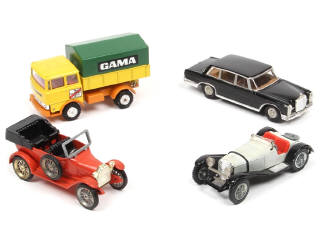 comprend : camion FAUN FKW bâché 'GAMA', MERCEDES SSK 1938 (manque pneu de secours) & FIAT 1911 - on y joint une MERCEDES-BENZ 600 de la marque R.W MODELL (manque roue de secours)