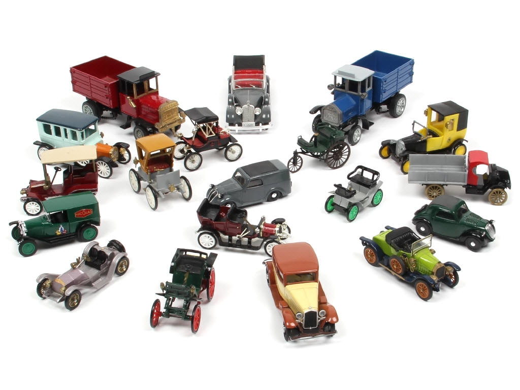 miniatures reproduisant notamment les modèles : MAN, DARRACQ, FIAT, BENZ, OLDSMOBILE, MERCER, DEDION BOUTON & HENSCHEL - on y retrouve notamment les marques : SAFIR, MATCHBOX, RAMI, MINIALUXE, DUGU, RIO & ZISS MODELL - avec petits manques & parties cassées
