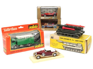 comprend notamment : FERRARI HP 275, DARRACQ V8, DELAGE, char amphibie PT.76 (encrassé - avec manques & parties cassées) & camion MERCEDES bétaillère - on y retrouve les marques : SOLIDO & BRUMM - les boites sont en états de 'b' à 'e'
