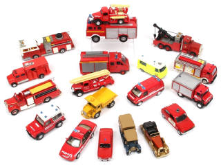 miniatures reproduisant notamment les modèles : RENAULT, PEUGEOT, KENWORTH, MERCEDES, FEUERWEHR & FODEN - on y retrouve les marques : SOLIDO, MAJORETTE, HONGWELL, CORGI TOYS, ROAD CHAMPS & MATCHBOX - quelques traces d'humidité & salissures sur quelques modèles - avec manques & parties cassées