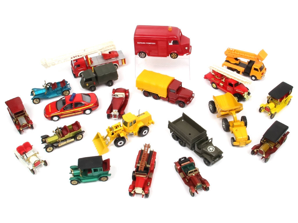 miniatures reproduisant notamment les modèles : FEUERWEIR, RENAULT, ROLLS ROYCE, STUTZ, JEEP, CITROEN & GMC - on y retrouve notamment les marques : SOLIDO, MATCHBOX & MINIALUXE - avec manques & parties cassées