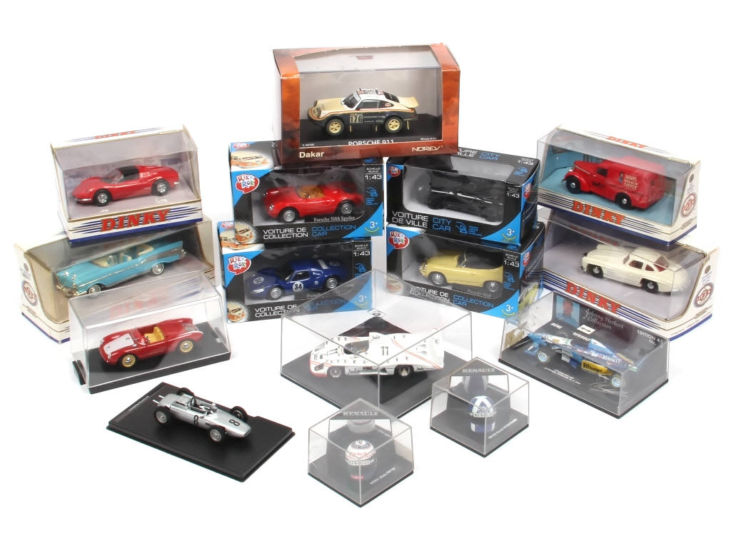 miniatures reproduisant notamment les modèles : PORSCHE, MERCEDES, COMMER & RENAULT - on y joint 2 casques de pilote (A.PROST & D.COULTHARD) - on y retrouve notamment les marques : NOREV, DINKY MATCHBOX, TROFEU & BRUMM
