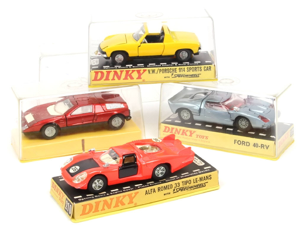 comprend : PORSCHE 914, ALFA ROMEO 33 TIPO Le Mans, FORD 40-RV & MERCEDES CIII - quelques petits éclats par endroits sur 3 exemplaires - 3 boites en état 'c'