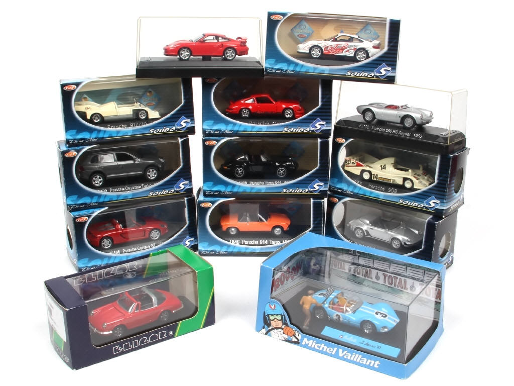 comprend notamment les modèles : 911, 914, CARRERA GT, 550 RS & 917/10 - on y joint une PORSCHE 911 TARGA de la marque ELIGOR & une VAILLANTE de la marque GRATON EDITEUR (boite en état 'c')