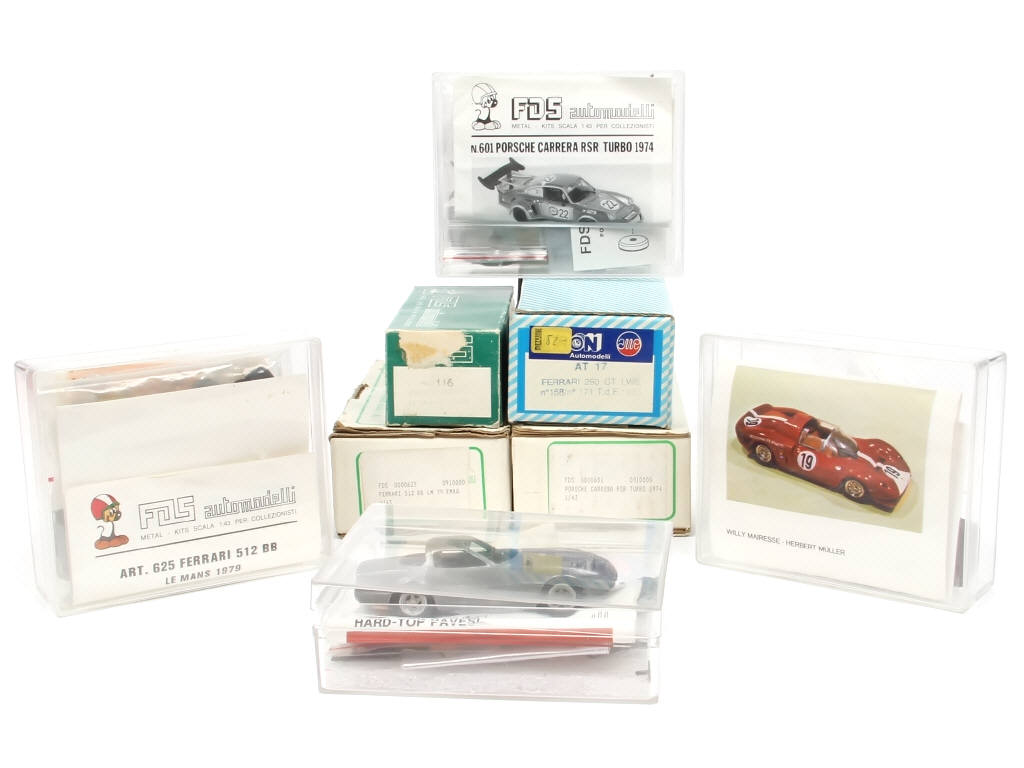 kits à monter - semblent complets - plusieurs modèles Le Mans - comprend : FERRARI 365 GTB4 1969, 365P 1966, 512 BB 1979, 250 GT LWB 1959 & PORSCHE CARRERA RSR turbo 1974 - on y retrouve les marques : FDS (4 exemplaires) & TRON - les boites sont en états de 'b' & 'c'