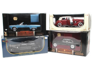 échelle 1/18ème - comprend : LINCOLN CONTINENTAL 1956 & 1961 (avec pièces plaquées or 24 carats), TOURING cabriolet 1937 & MERCEDES-BENZ 770K 1938 - on y retrouve les marques : ROAD SIGNATURE & SIGNATURE MODELS - quelques étiquettes collées sur les boites