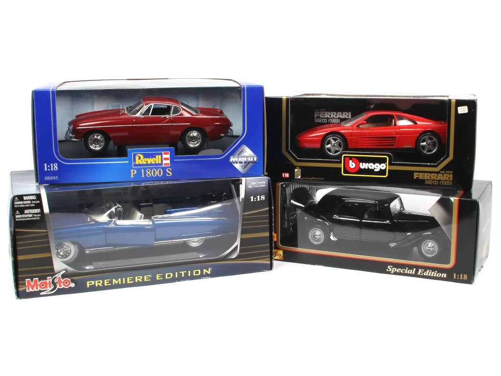 échelle 1/18ème - comprend : FERRARI 348tb 1989, VOLVO P 1800 S, CITROEN 15 CV 1952 (spéciale édition) & CADILLAC ELDORADO BIARRITZ 1959 (première édition) - on y retrouve les marques : REVELL, MAISTO & BBURAGO