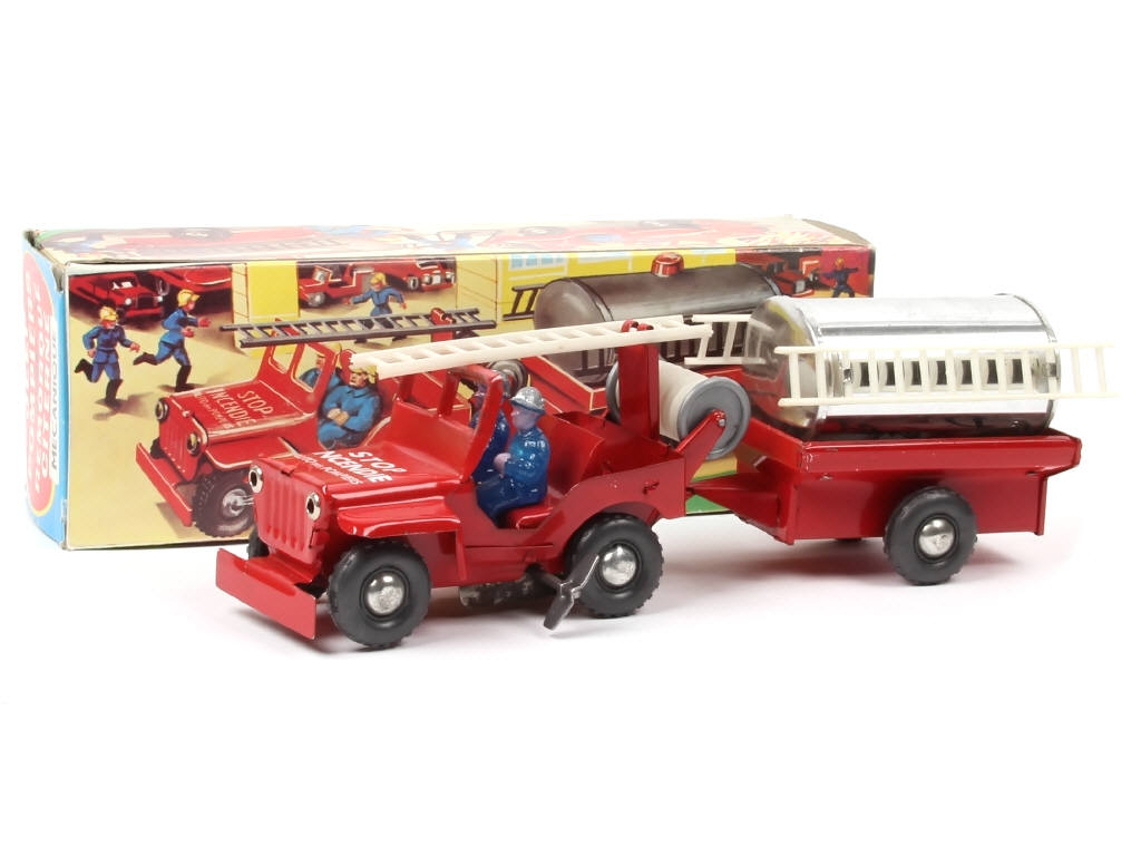 JOYAX (FRANCE) JEEP de pompiers avec remorque-citerne en tôle rouge
