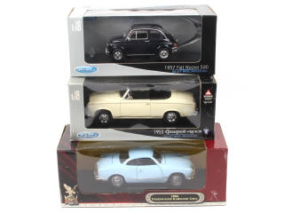 échelle 1/18ème - comprend les modèles : FIAT 500, PEUGEOT 403 cabriolet 1955 & VOLKSWAGEN KARMANN GHIA 1966 - on y retrouve les marques : WELLY & ROAD SIGNATURE - quelques petits accrocs sur les boîtes