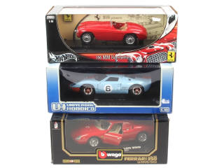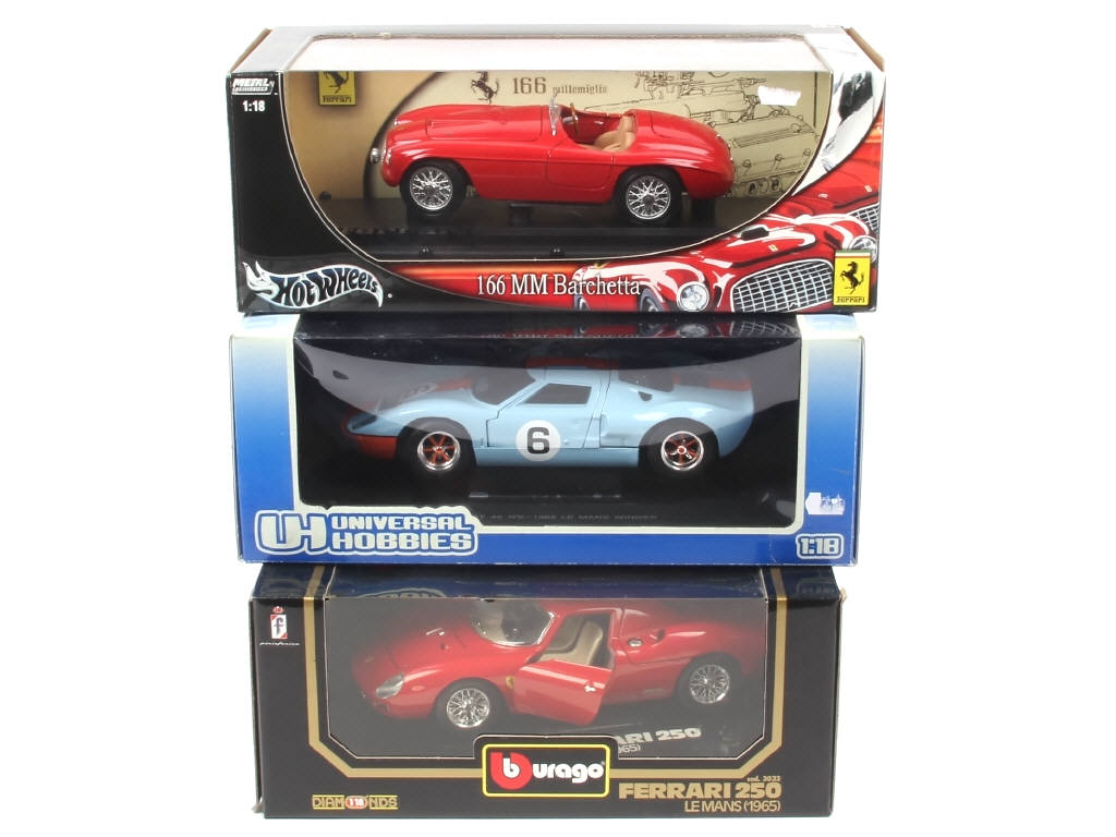échelle 1/18ème - comprend les modèles : FERRARI 166 MM, 250 & FORD GT 40 Le Mans 1969 - on y retrouve les marques : BBURAGO, UNIVERSAL HOBBIES & MATTEL