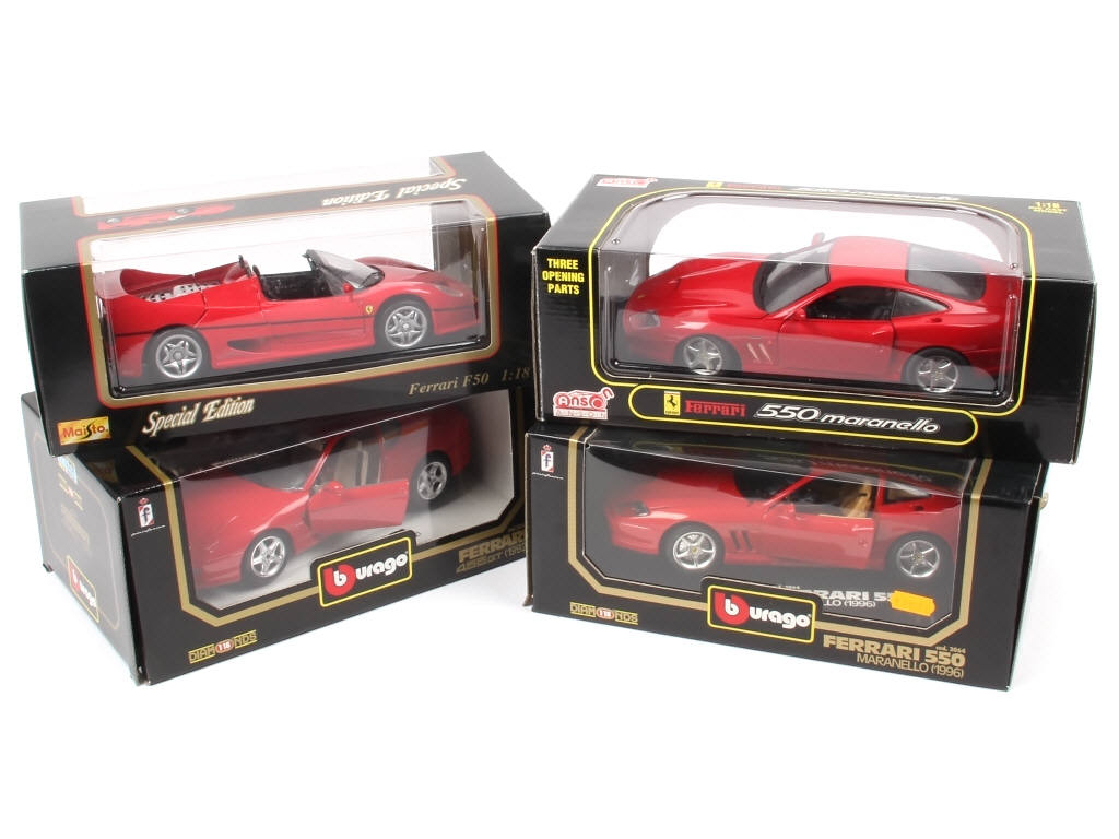 échelle 1/18ème - comprend les modèles : 550 MARANELLO (2 exemplaires), F50 & 456 GT - on y retrouve les marques :BBURAGO, MAISTO & ANSON