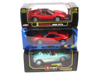 échelle 1/18ème - comprend les modèles : FERRARI 328 GTS, F355 & CHEVROLET CORVETTE 1957 - on y retrouve les marques : ANSON, BBURAGO & UT MODELS