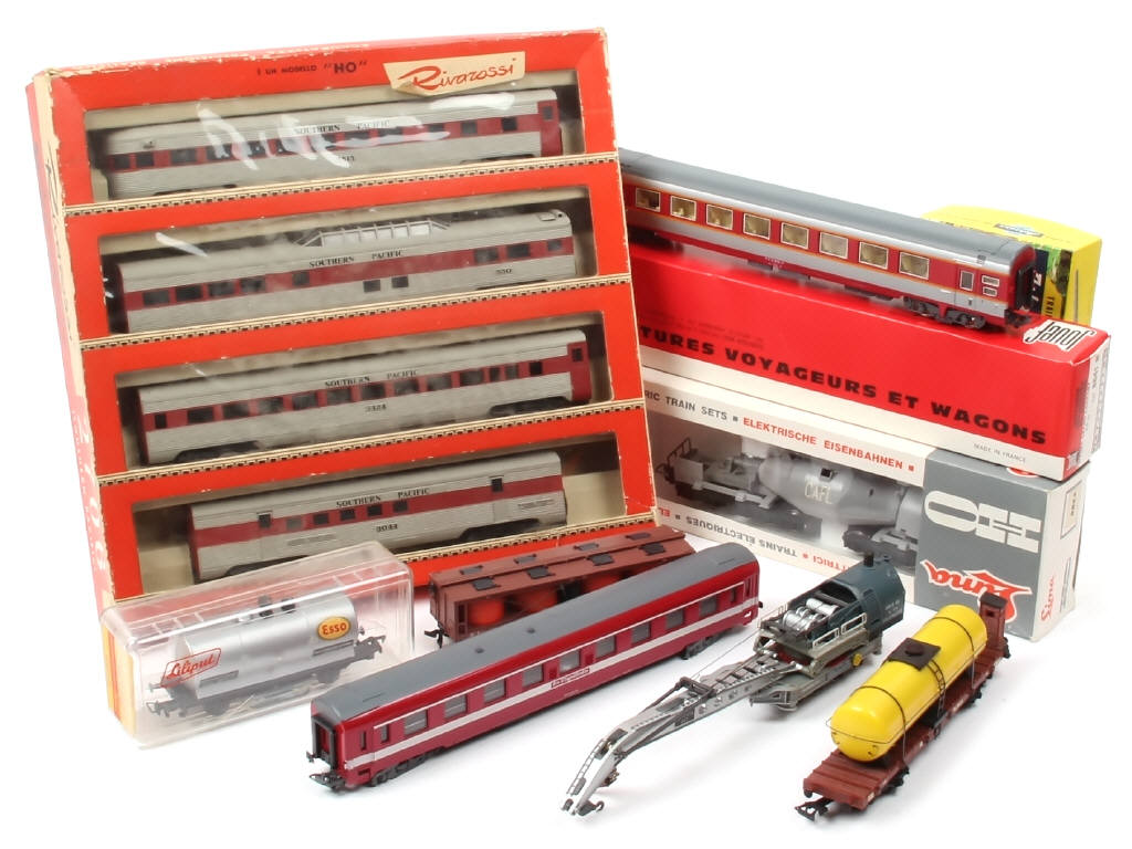 on y retrouve les marques : RIVAROSSI, JOUEF, ATHEARN, LIMA & LILIPUT (trace de métal fatigue sur un élément) - les boîtes sont en états de 'b' à 'd' (3 exemplaires sans boîte) - quelques manques & parties cassées sur certains exemplaires