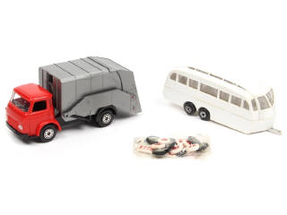 comprend : SAVIEM SG4 à ordures, caravane (provient du coffret 'HENON') & un sachet de pneus en partie ouvert de 13 roues (jantes légèrement fondues) - avec petits manques & parties cassées