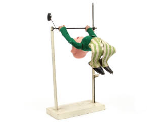 hauteur : 40 cm - fabrication d'avant guerre en carton bouilli & tissus (yeux en verre) - avec mécanisme permettant de faire tourner le personnage autour de la barre - fissures sur les mains - habits plus ou moins salis & avec manques - barres & socle repeints