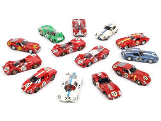 miniatures reproduisant notamment les modèles : PORSCHE & FERRARI - on y retrouve notamment les marques : MODEL BOX & BRUMM - avec manques & parties cassées - quelques parties repeintes & décalques ajoutés