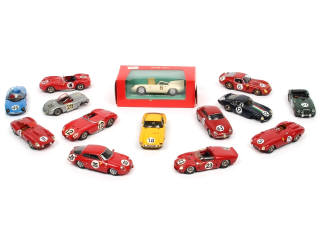 miniatures reproduisant notamment les modèles : MASERATI, FERRARI, AUSTIN HEALEY & JAGUAR - on y retrouve notamment les marques : STARTER, PROVENCE MOULAGE, MODEL BOX, PROGETTO K, LEADER KITS, JIELGE & AUTOMANY - avec manques & parties cassées - un modèle en boite (état 'c')