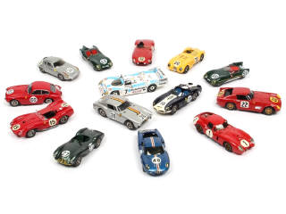 miniatures reproduisant notamment les modèles : ASTON MARTIN, ALPINE, JAGUAR, LOTUS, FERRARI, PORSCHE & MASERATI - on y retrouve les marques : STARTER, PROVENCE MOULAGE, JIELGE, IDEA 3, GAFFE, PROGETTO K & NESTOR - avec manques & parties cassées - une carrosserie en état 'E'