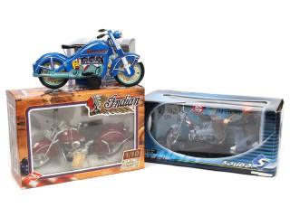 comprend : mobylette 'MOTOBECANE', INDIAN (un pneu en partie coupé) & HARLEY DAVIDSON (série limitée - moteur à friction) - on y retrouve les marques : SOLIDO, GUILOY & TIN TOY (reproduction)