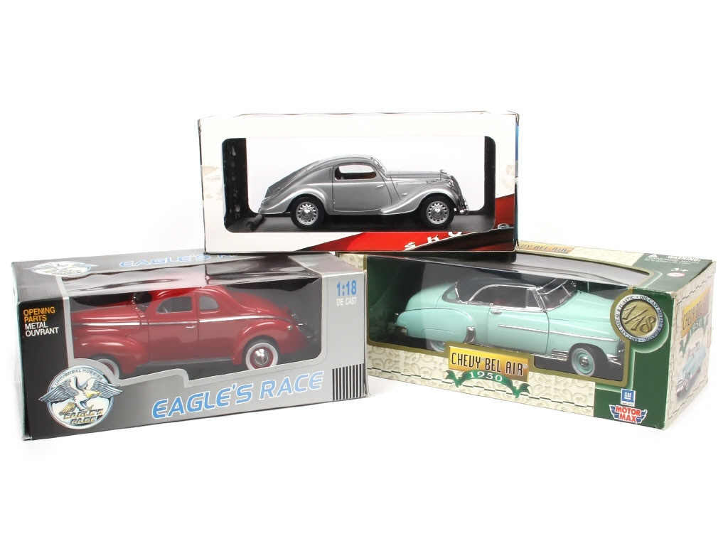 échelle 1/18ème - comprend : SKODA POPULAR SPORT-MONTE CARLO, FORD DELUXE coupé 1940 & CHEVROLET CHEVY BEL AIR - on y retrouve notamment les marques MOTOR MAX & UNIVERSAL HOBBIES - quelques accrocs sur les boites