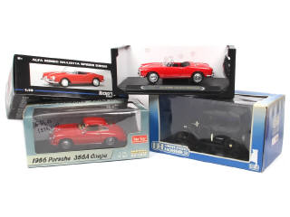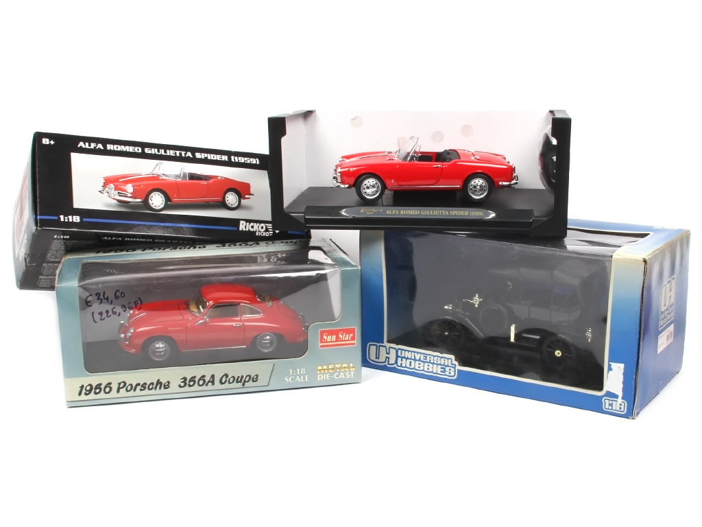 comprend : ALFA ROMEO GIULIETTA SPIDER 1959, PORSCHE 356A coupé 1956 & FORD MODEL T TOURING - on y retrouve les marques : RICKO, UNIVERSAL HOBBIES & SUN STAR - boites plus ou moins salies dont 2 avec adhésif sur les rabats
