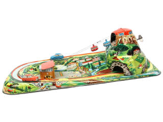 dimensions : 47x20x15 cm - moteur à ressort (fonctionne) - en action le câble du téléphérique tourne et entraine les bennes qui vont et viennent - un bras articulé pousse les véhicules du bas vers le haut du circuit les libérant l'un après l'autre & ainsi de suite - BEL ETAT DE CONSERVATION !