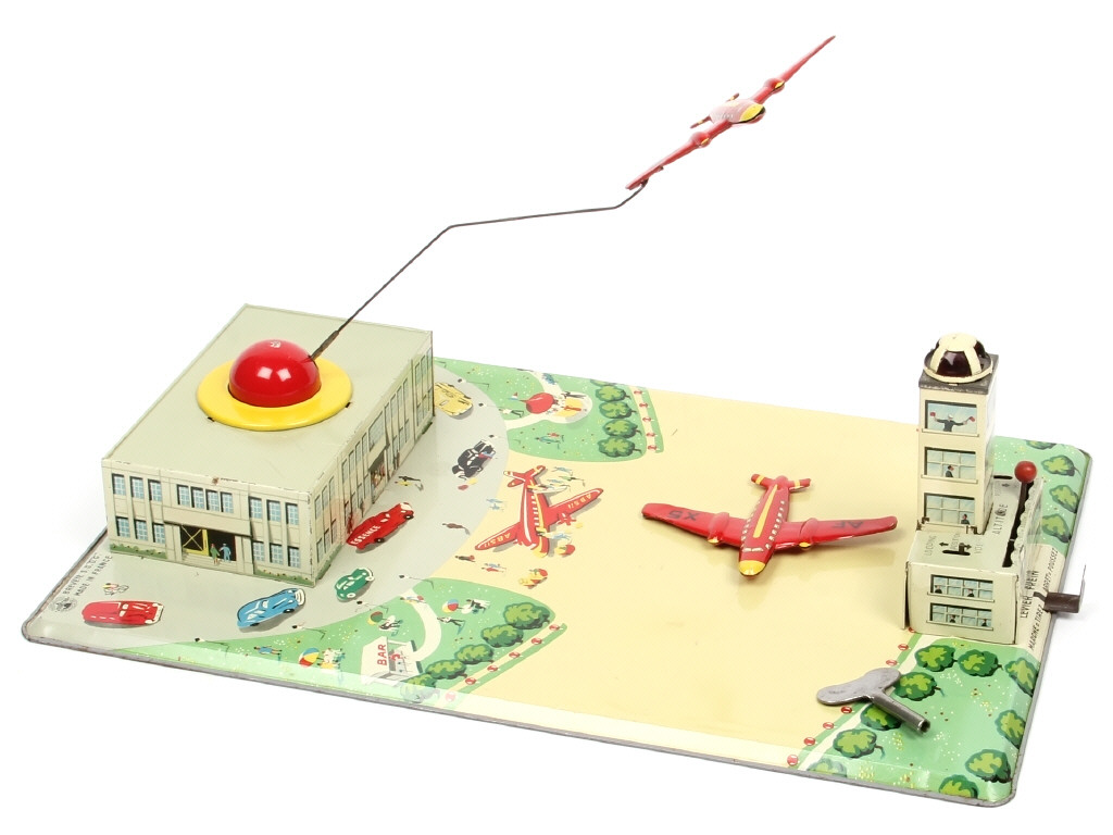 dimensions 36,5 x 24,5 cm - en action l'avion exécute un vol ou des looping - avec moteur à clef (fonctionne) & système lumineux (à 2 positions) tour de contrôle non testé - avec 2 avions & clef - quelques éclats par endroits - possibilité de petits manques - traces d'oxydation