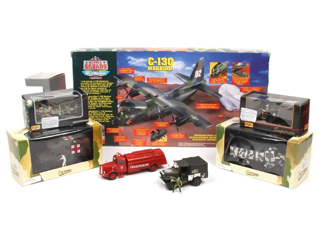 miniatures reproduisant notamment les modèles : DODGE, HUMMER, JEEP, SAURER & OPEL - on y retrouve les marques : MAISTO, C.C.C & VITESSE - petites transformations & décalques ajoutés sur certains modéles - quelques petits accrocs sur les boites