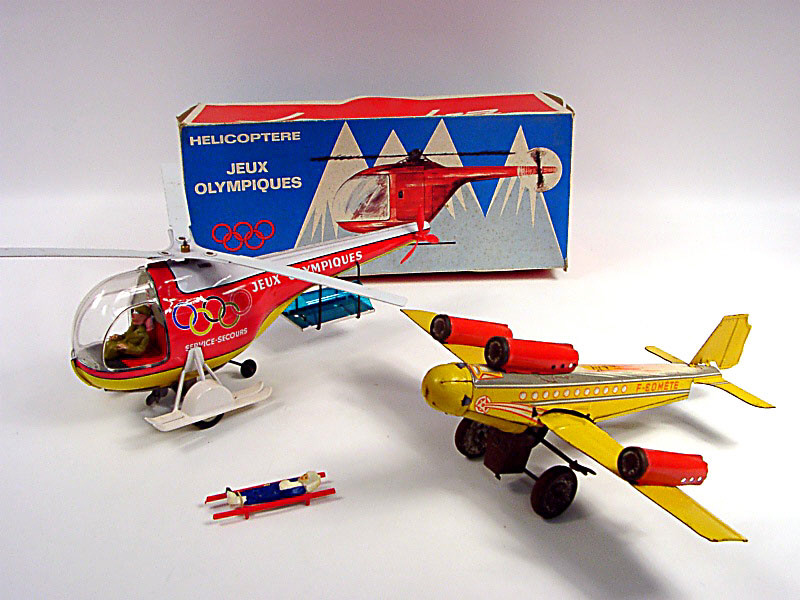 longueur 34 cm - moteur à ressort (fonctionne) - avec brancard & blessé - en action, l'hélicoptère avance & le rotor tourne - avec bruiteur