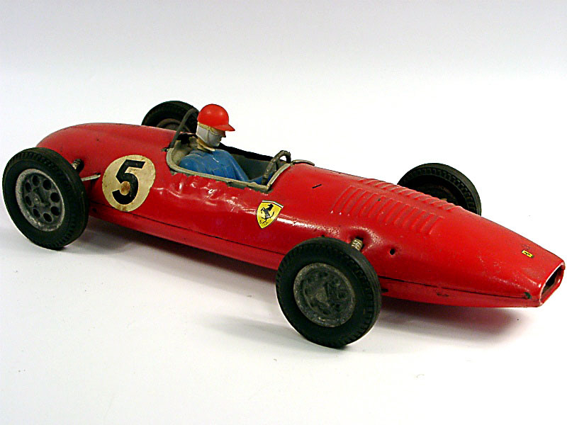 longueur 37 cm - moteur à friction (à revoir) - manque pare-brise & quelques éléments de suspension - doute sur l'origine de la peinture & la tête du pilote - présence d'autocollants FERRARI vraisemblablement non d'origine