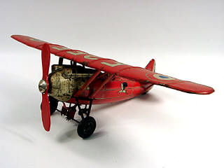 envergure 48 cm - moteur à ressort (fonctionne) - le mécanisme fait avancer l'avion & touner l'hélice - modèle produit de 1933 à 1941 - hélice & dérive arrière repeintes - quelques traces d'oxydation & pneu craquelé - manque roulette de queue