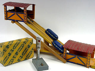 2ème version de 1956 - dimensions 90 x 40 cm - tôle & bois - mouvement à billes faisant monter & descendre simultanément les deux cabines - manque billes & notice - roues des cabines oxydées