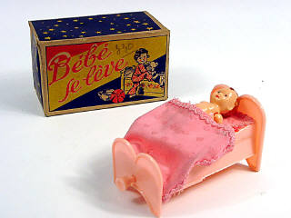 longueur 11,5 cm - mécanisme à ressort (fonctionne) - en action, en tirant sur un bouton le bébé sort de son lit & se met au dessus de son pot de chambre tandis que sa couverture se relève - élastique de maintient des bras à changer
