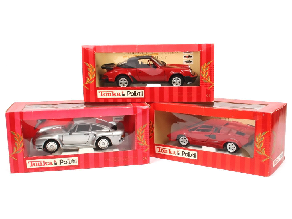 échelle 1/16ème & 1/18ème - comprend : PORCHE 911 TURBO, 959 (avec clef de la voiture à l'échelle 1) & LAMBORGHINI COUNTACH - quelques accrocs sur les boites